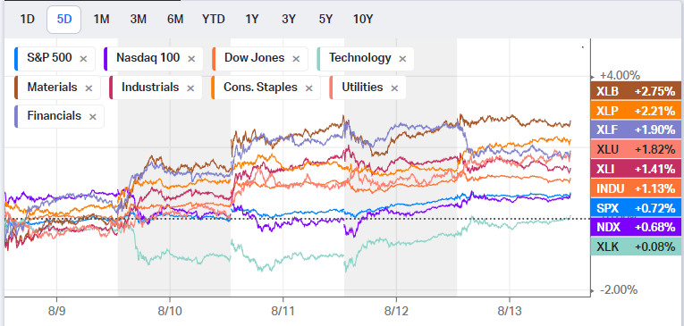2 out of 3 major composite indexes finished green for the week with the Nasdaq being the outlier. This comes after a slowdown in major earnings reports from Tech companies having some big earnings reports come out over the last few weeks. However, broken out into the Nasdaq 100, that index did increase by ~0.6% during the week. This continues the trend of some of the big players in the index inching upward as the rest of the market sees some signs of weakness. In, my opinion I think we are starting to hit an inflection point with some of the tech stocks and see some consolidation in the markets with a sideways move in the Nasdaq. The DJIA, hit it big with the infrastructure bill passing and boosting Industrials in the overall market. The S&P500 inched higher as well at 0.72% over the 5 day period. In the chart below you can see Industrials and Consumer Staples being the biggest market sectors for the week. I think it’s important to not the dip and lateral move across the technology market at the bottom of the chart.
