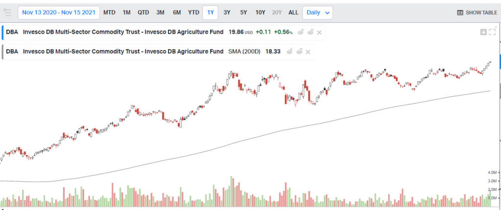 Another way I am looking to play this trade is with DBA. It is another fund based on futures contracts but of various commodities other than wheat, including soy, corn, cocoa, sugar among others.