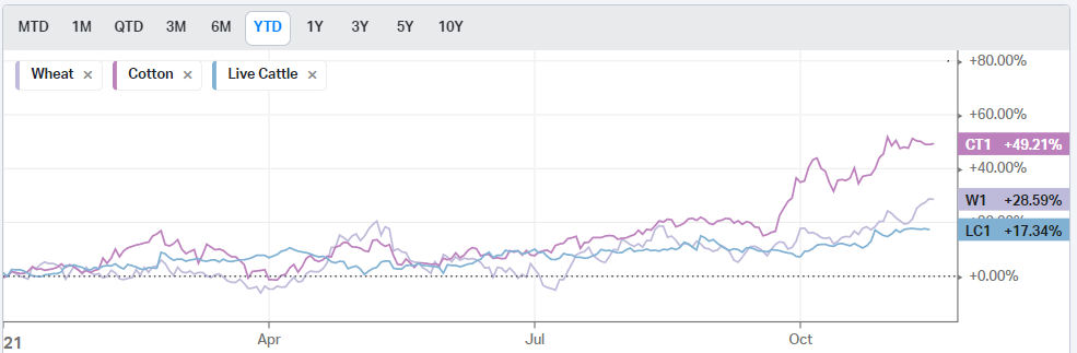 With other inflationary forces in play, Wheat is starting to tick upward in what appears to be a potential bull run. YTD it has increased by 28.5%, lagging behind cotton, but higher than many of the other essential grains/commodities. Wheat and other commodities can be a good way to hedge higher inflation. We have already seen inflation rise 6% YOY as of last week. With no real reason to think inflation is going away anytime soon, prices could very well continue to climb.