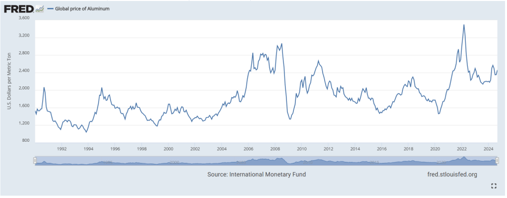 Here is what I was looking at when I saw the trend in aluminum. You can see in 2022 there was an incredible spike in Aluminum prices coming out of 2020 and 2021. Since then we had a reversion and have been consolidating for about 2 years.