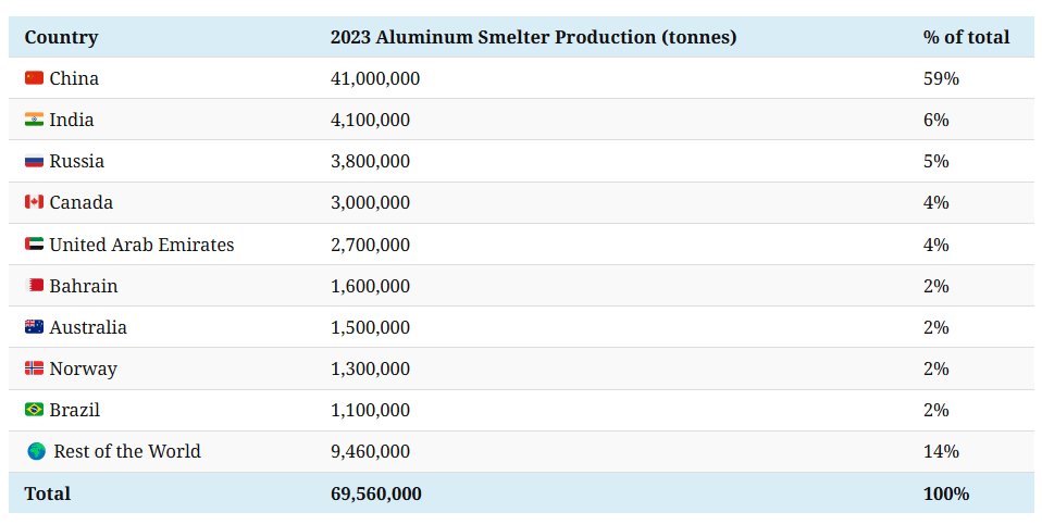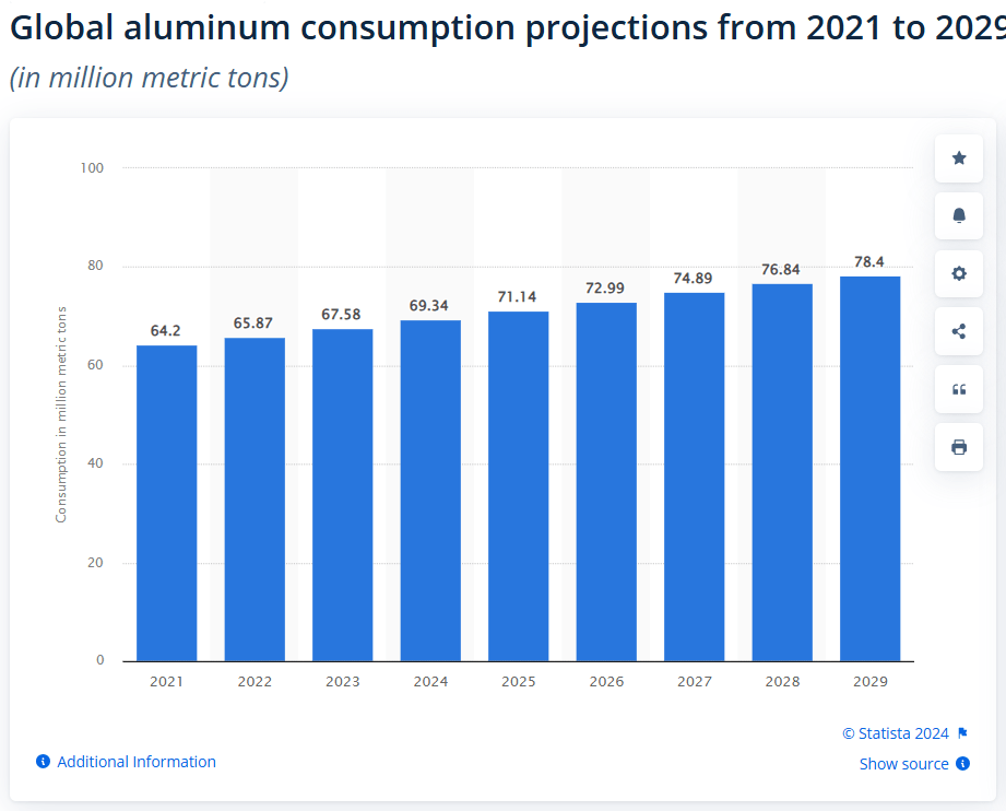 Over the next 5 years aluminum consumption is expected to increase by 13%. Below is the breakdown of Aluminum production by country with a clear leader in China, producing almost 60% of global production. With the election that took place in the U.S. and the policies Trump wants to put in place, getting into an economic trade war can be an inflationary environment for this resource. China is also nearing physical capacity of production and global aluminum production will need to expand in other parts to accommodate. The main drivers of this production is EV manufacturing, growth in aluminum packaging expected to grow by 3M tons per year by 2030, electrification of urban areas as well as green initiatives in other countries.