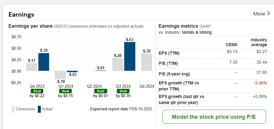 After looking through their earnings, the increase in aluminum prices really helped their profit margin and cash flow from operations. In an environment where aluminum prices are expected to stay elevated, and it does not appear that there will be a significant slow down in global growth, CENX should be able to maintain this performance.